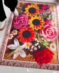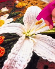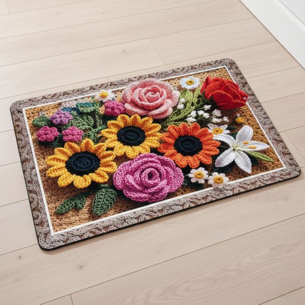Об'ємний квітковий принт імітує в'язання нитками, а яскраві кольори додають акцентності. Оригінальний килимок стане окрасою будь-якої домівки, створюючи затишну атмосферу
