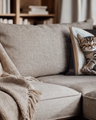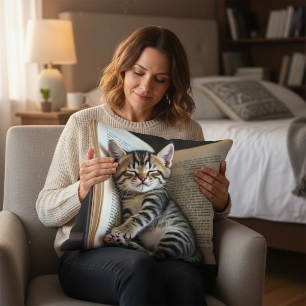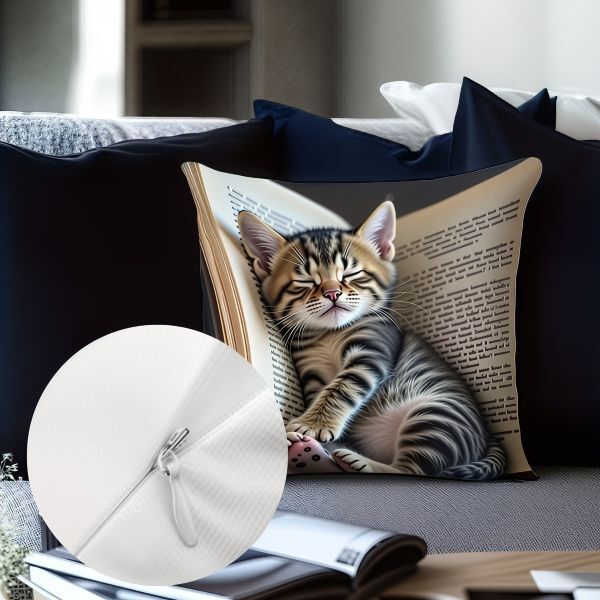 Наволочки із зображенням сплячого котика, що схилився на розкриту книгу, мають надзвичайно милий вигляд. Вони викликають усмішку й створюють в оселі затишну атмосферу