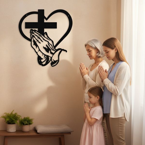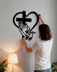 Металевий настінний декор у формі хреста, серця та молитовних рук символізує віру, любов і мир. Така композиція створює відчуття гармонії й наповнює простір духовним спокоєм