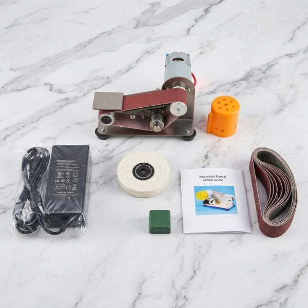 У комплекті вже є все необхідне для роботи: 10 шліфувальних стрічок різної зернистості, полірувальний круг, паста та блок живлення. Це дозволяє одразу розпочати обробку і швидко адаптувати інструмент під конкретні потреби